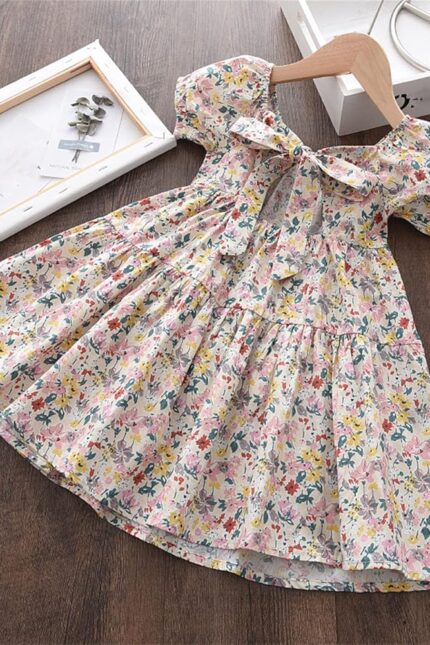 This adorable Multi-Color Frock for girls features a playful floral-print design with a cute bow detail. The dress offers a comfortable and flowy fit, making it perfect for casual outings or special occasions.