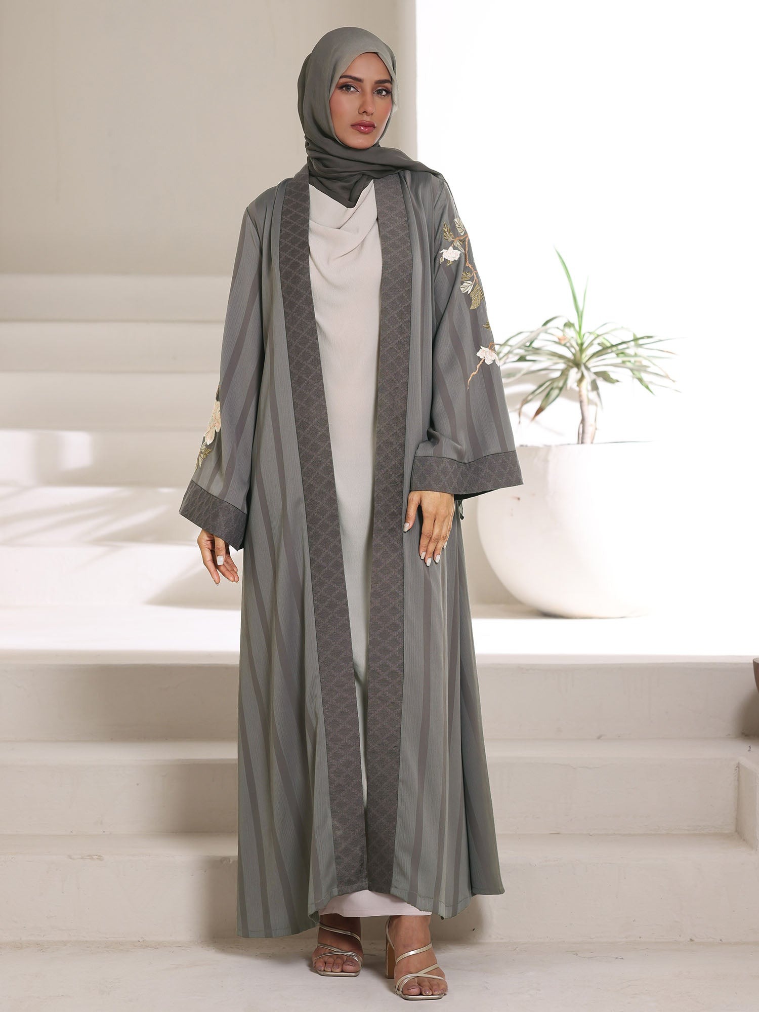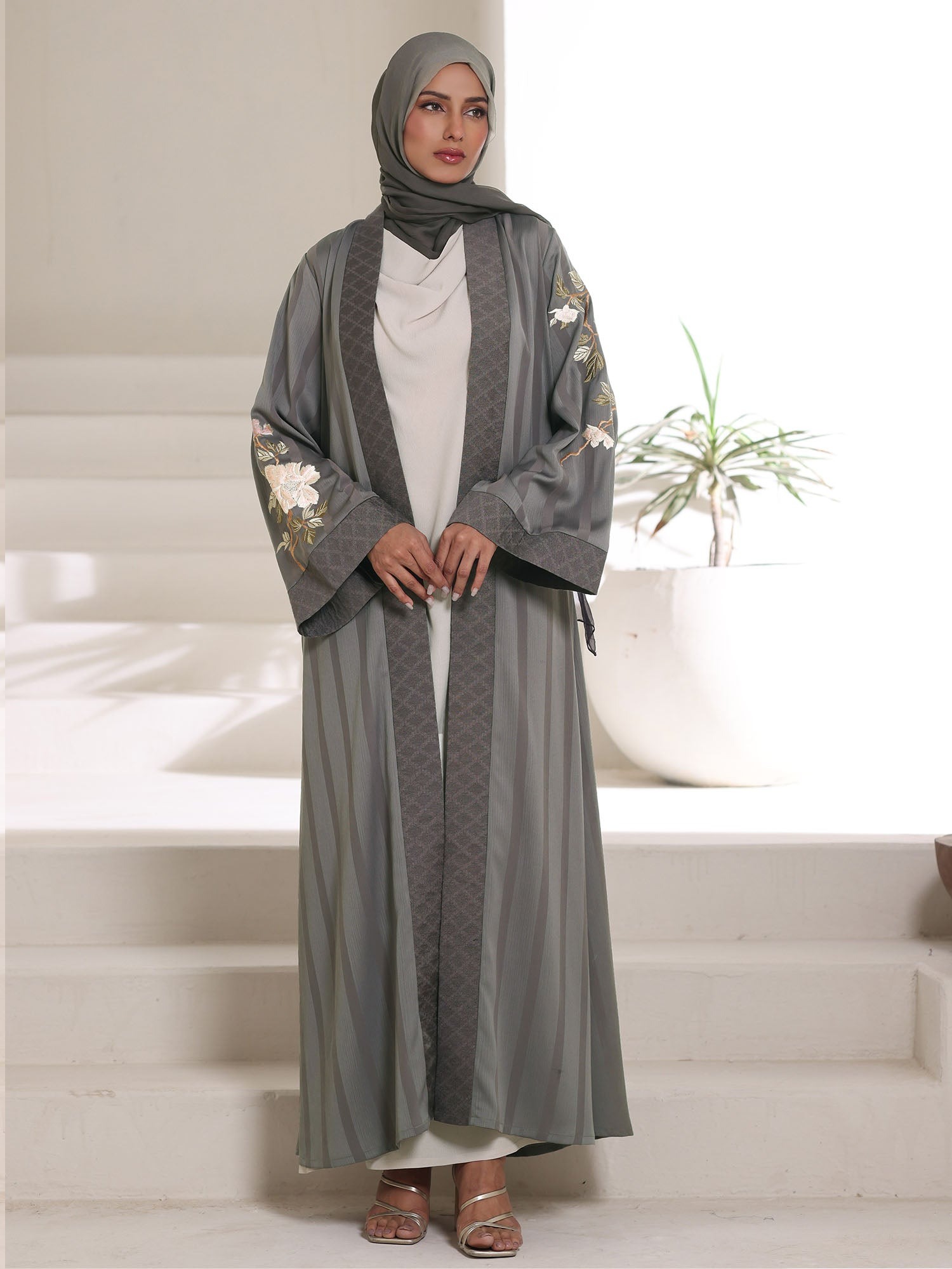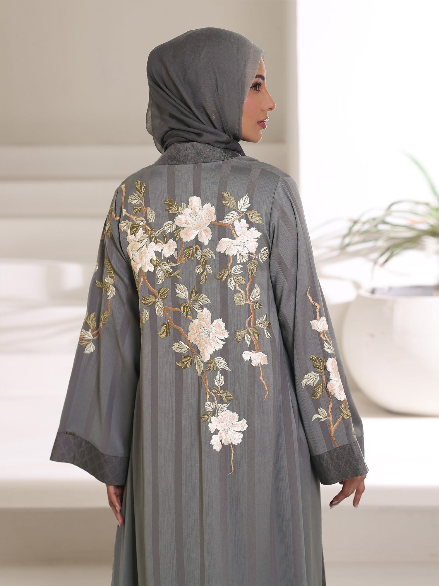 The Zeenat-E-Tsubaki Kimono is a celebration of modest luxury. Taking inspiration from the timeless beauty of Japanese floral art, ‘Zeenat-E-Tsubaki’ translates to the ‘Beauty of the Camellia.’ This piece is meticulously tailored to provide a modest yet flowy silhouette that drapes elegantly over any outfit.